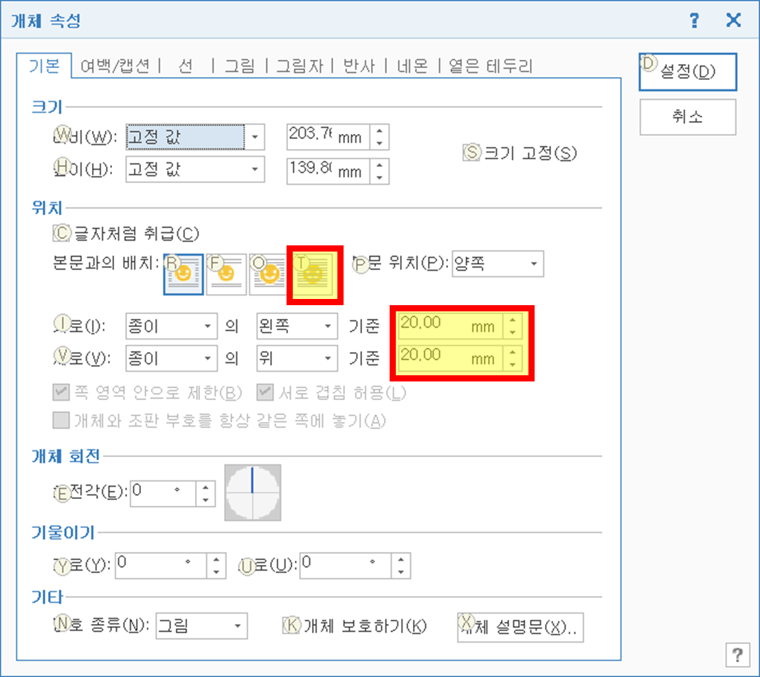 이미지 위에서 마우스 우클릭을 해서 속성으로 들어간 후 다음과 같이 수정한다.