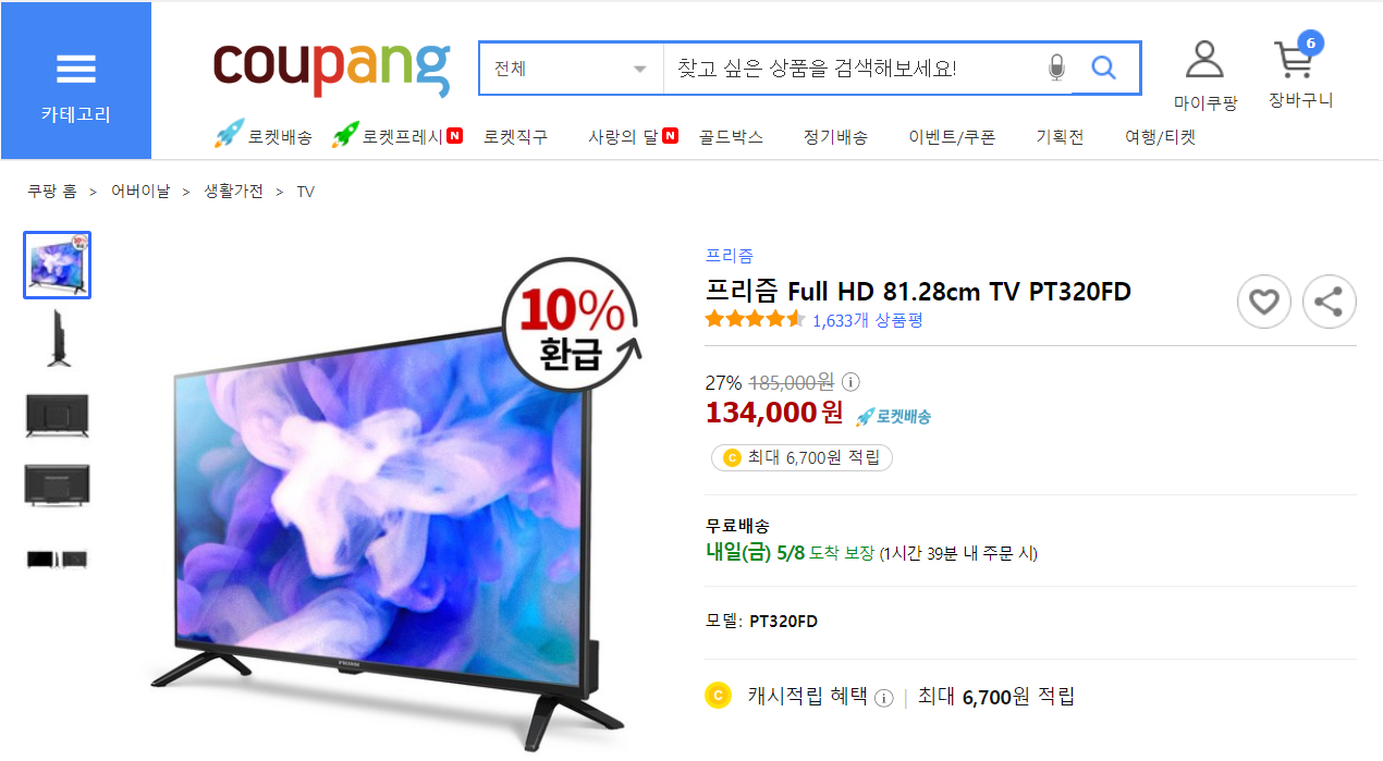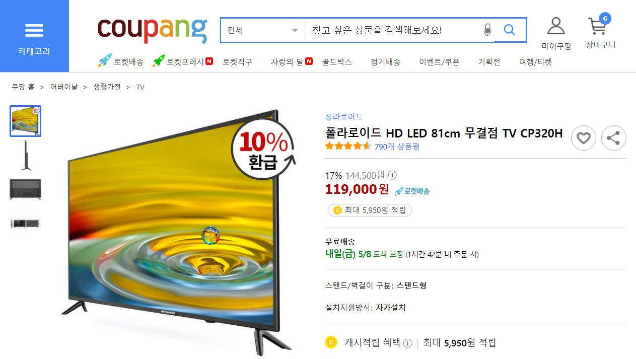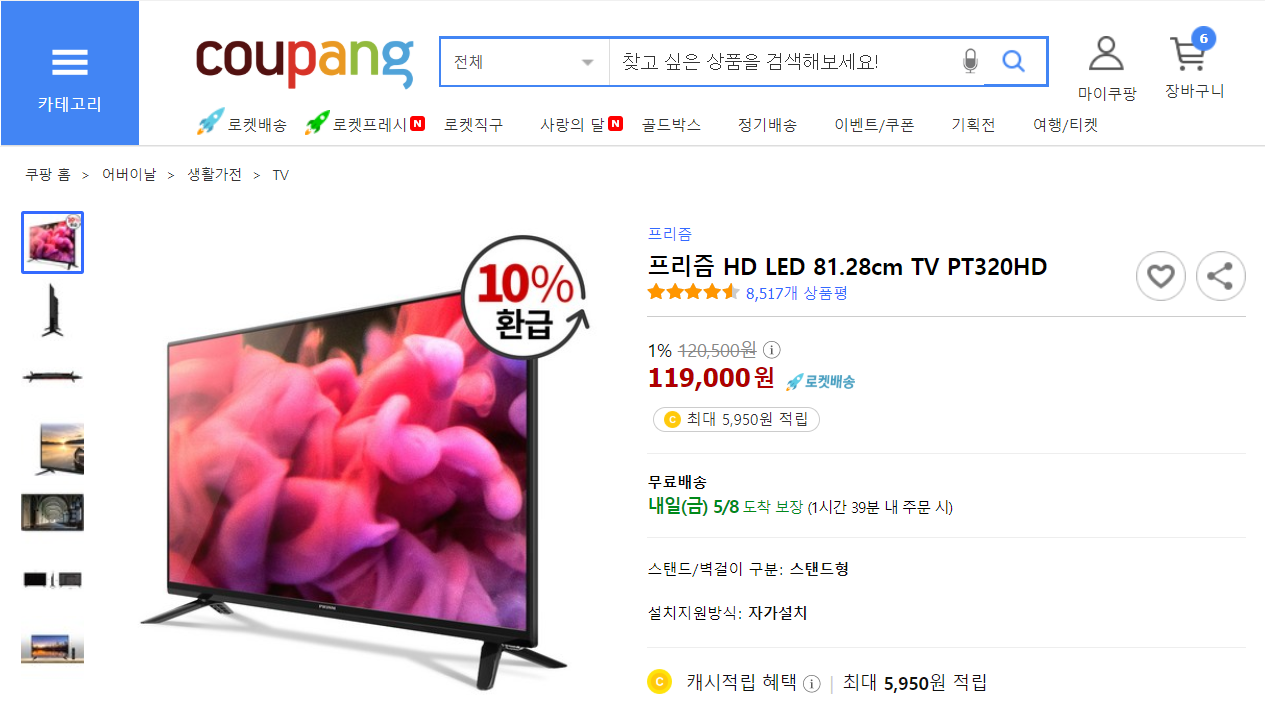 처음엔 중고나라에서 10만원 미만으로 20인치 중반 모니터를 구경했다. 어찌어찌하다가 쿠팡으로 흘러가게 되었고, 쿠팡에는 32인치 TV가 119,000원에 판매 중이었다.