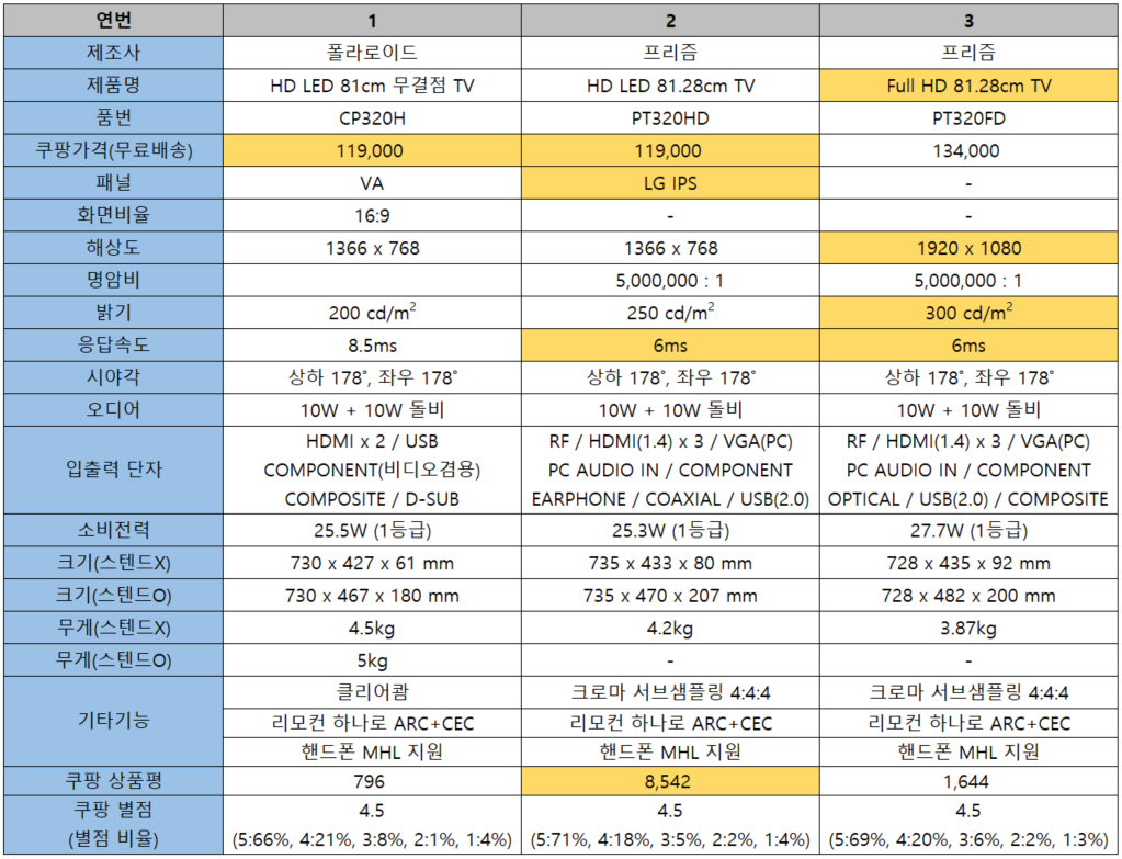 후보 3번인 FHD가 눈에 들어왔다. 패널이 가장 중요하다고 생각하는데, 페널에 대한 정보는 찾을 수 없었다. 가장 큰 메리트는 FHD의 높은 해상도이다. 구입하고자 하는 이유가 TV 시청이 아닌 노트북의 보조 모니터 이므로 화질에 대한 부분은 일정 부분 포기하고 높은 해상도를 선택했다.