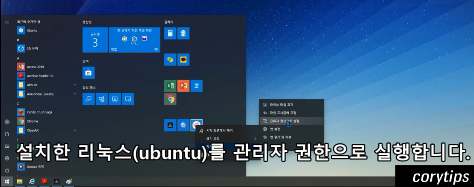 리눅스 아이콘에 마우스 우클릭하여 관리자 권한으로 실행한다.