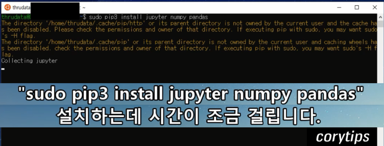 위의 명령어로 jupyter, numpy, pandas를 설치합니다. 설치하는데 시간이 조금 걸립니다. (한 5분 정도)