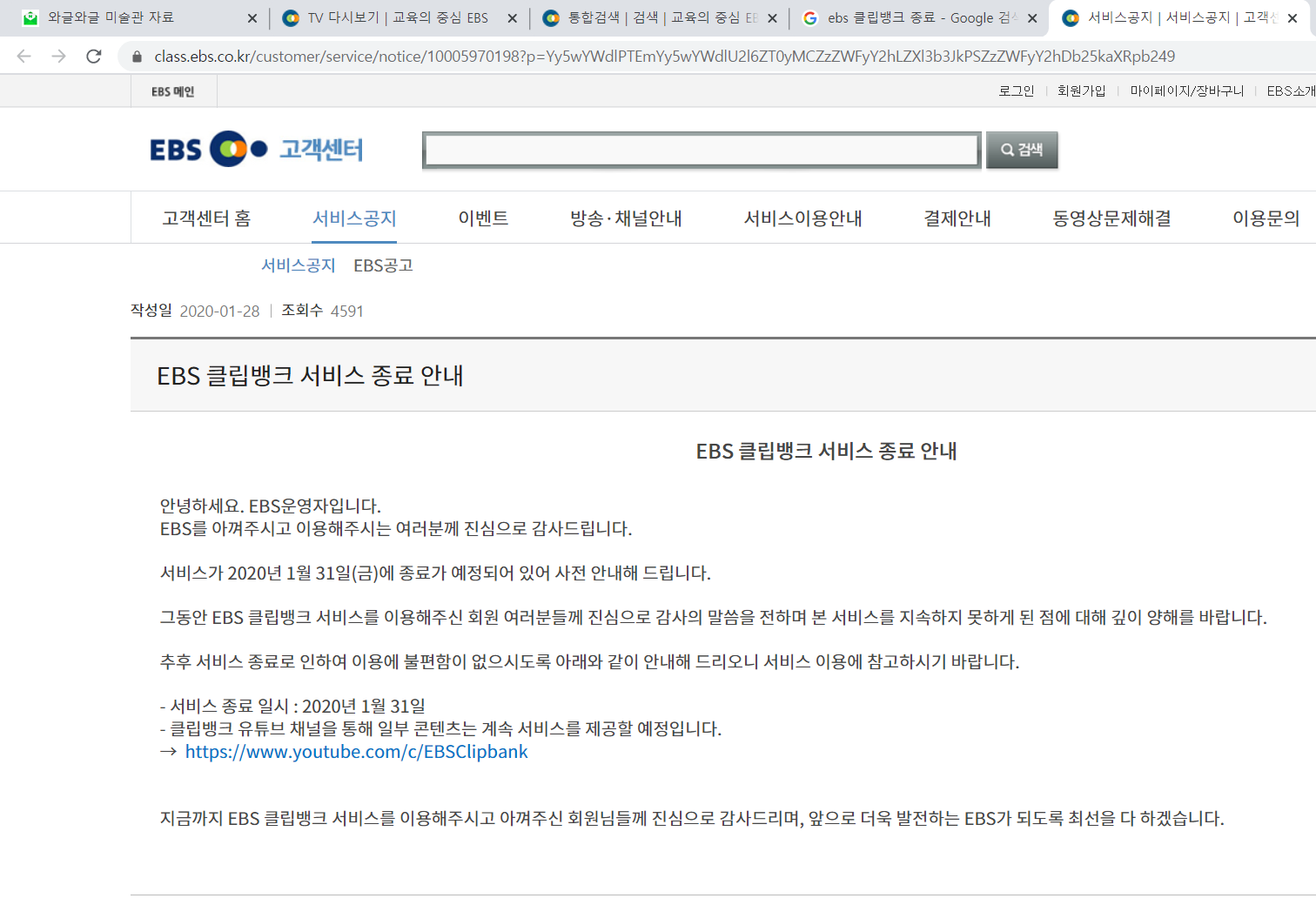 하지만, 위 사진에서 보이는 "EBS 클립뱅크" 접속되지 않는다. 그 이유는 EBS가 클립뱅크 서비스를 2020년 1월 31일까지만 제공하고 종료하였기 때문이다. 클립뱅크의 일부 자료들은 유튜브 채널을 통해 제공한다고 한다. 동영상은 유튜브에 올라가지만, 아이들이 실습할 수 있는 이미지 자료들은 따로 제공되는 곳이 없다.