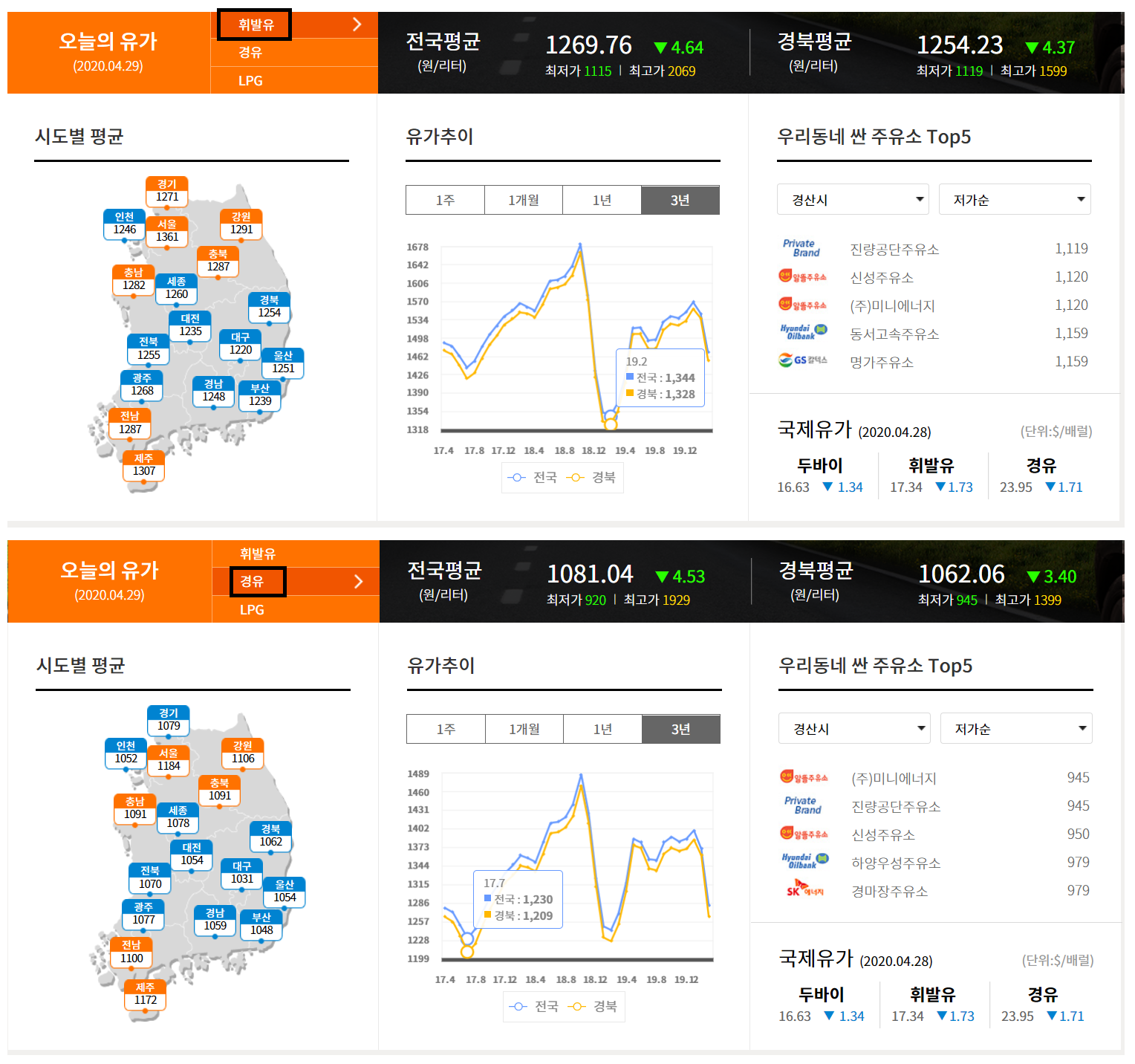 경유는 2017년 7월에 기록한 1,230원이 최근 3년간 가장 저렴한 가격이었다. 휘발유는 2019년 2월에 기록한 1,334원이다. 그러고 보니 기름값은 전국 평균보다 경북이 항상 저렴했다.