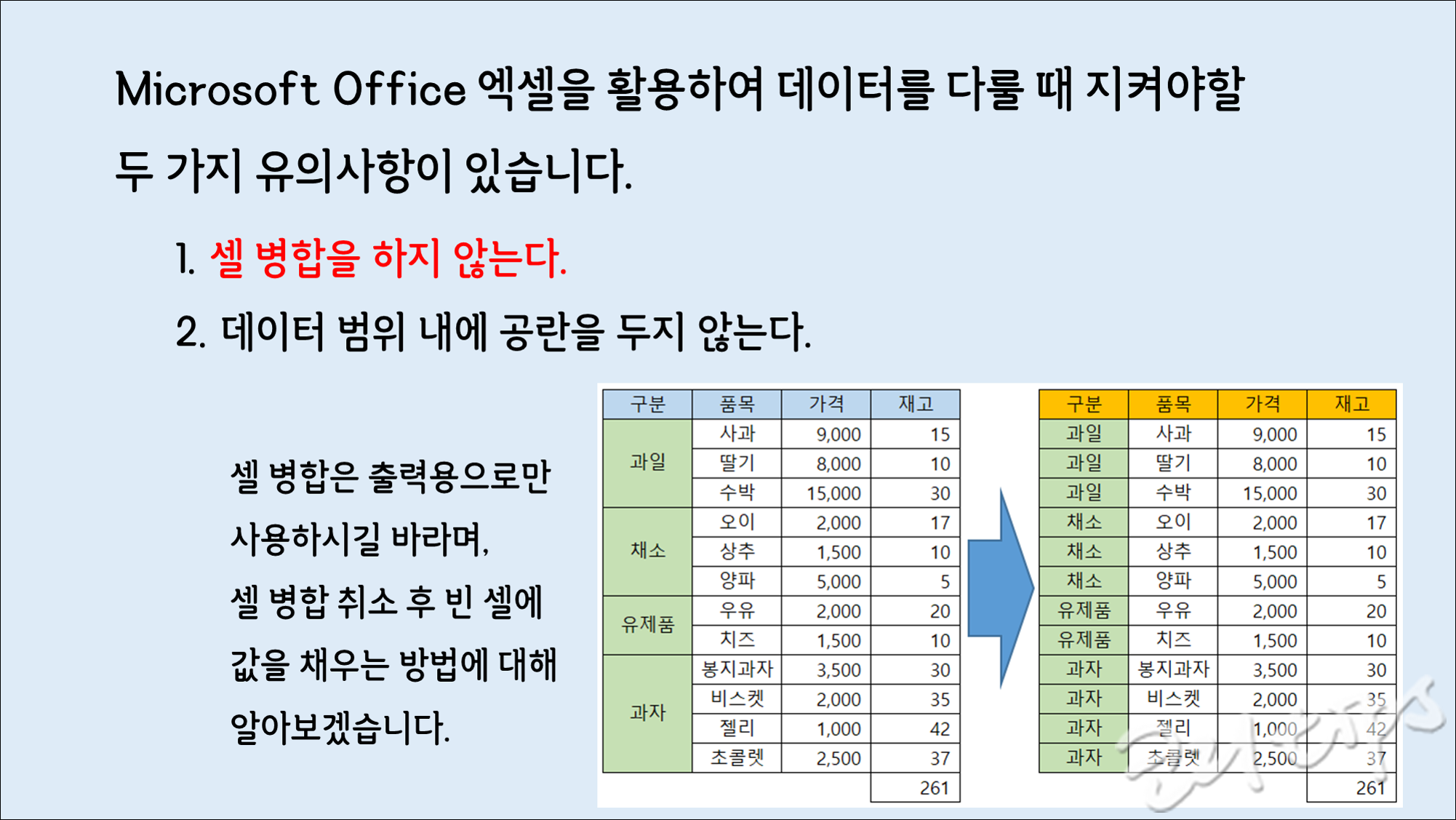셀 병합은 표의 가독성을 높이기 위해 유용한 기능에는 틀림이 없지만, 데이터를 다루는 것에는 많은 문제점이 발생합니다. 셀 병합은 엑셀로 작업한 결과를 출력할 때만 사용하기를 권장합니다.