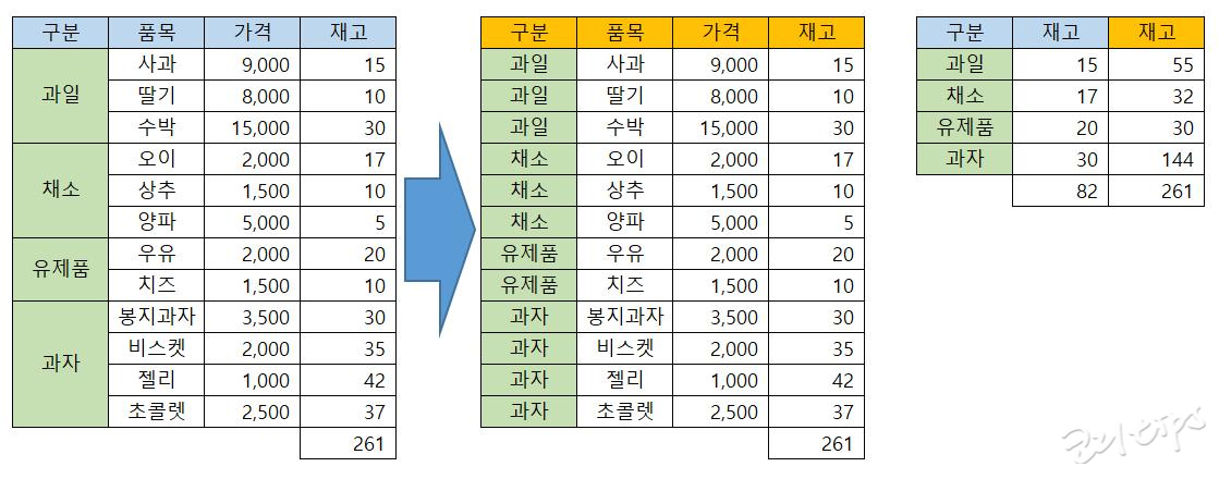 위의 예제파일에서 왼쪽 테이블은 "구분" 열에 셀 병합이 적용되어 있습니다. 셀 병합을 취소하고 빈 셀에 값을 채워서 오른쪽 테이블과 같이 만들어 보겠습니다.