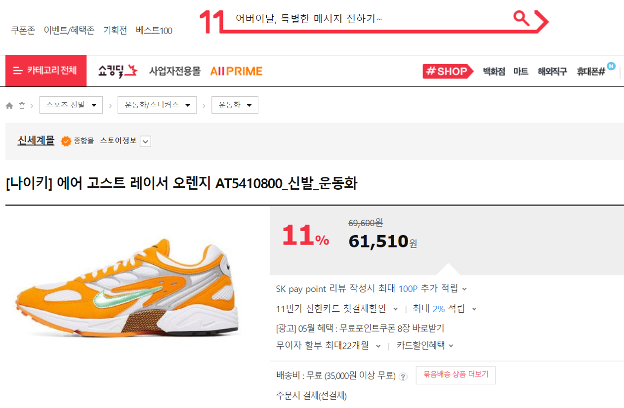 최저가를 찾던 중 11번가에 60,770원짜리 오렌지색 신발을 발견했다. 거의 매번 검정색 신발을 신던 나에게 오렌지색 신발은 신선한 충격으로 다가왔고, 그대로 구입했다.