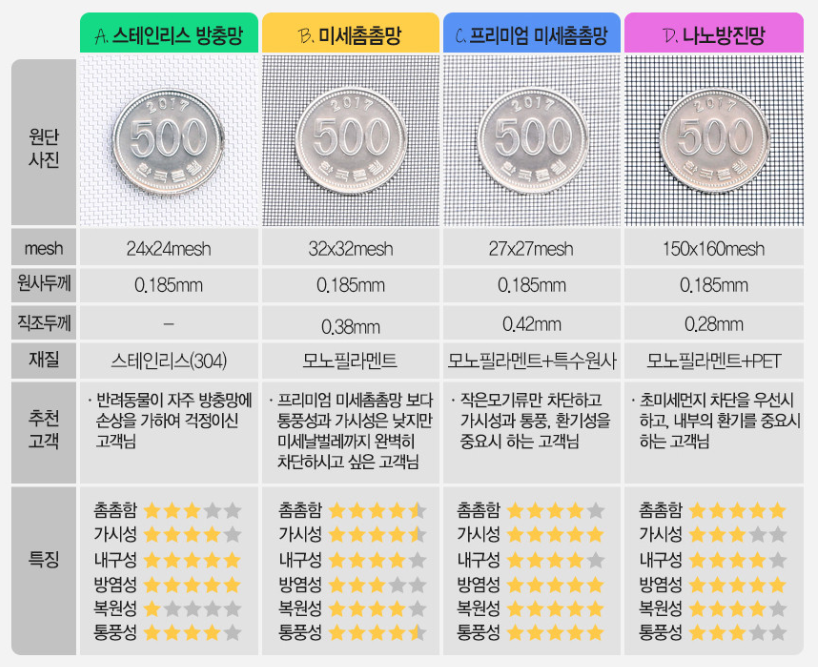 방충망 종류는 회사마다 다르지만 대충 다음과 같이 구분된다.