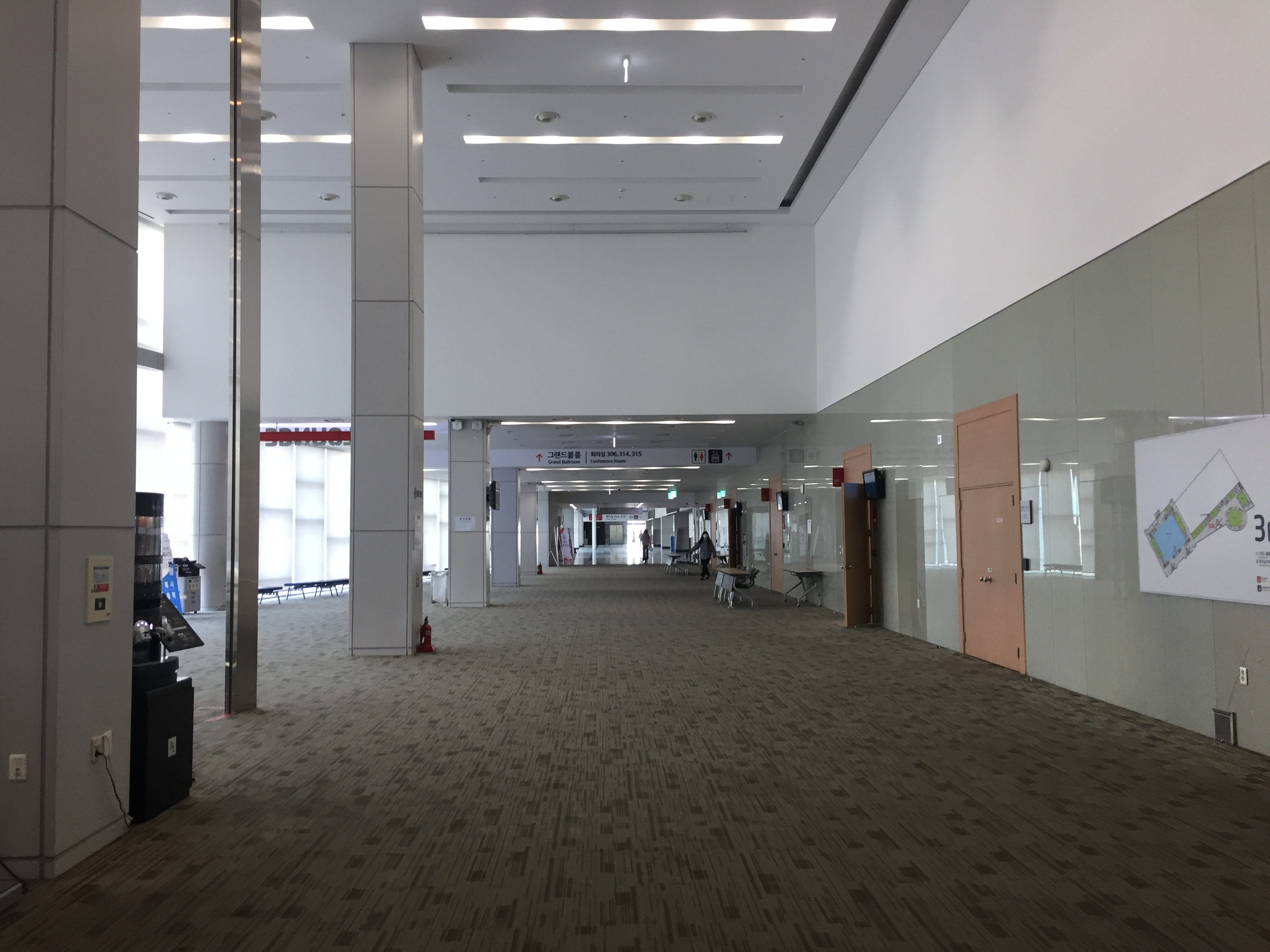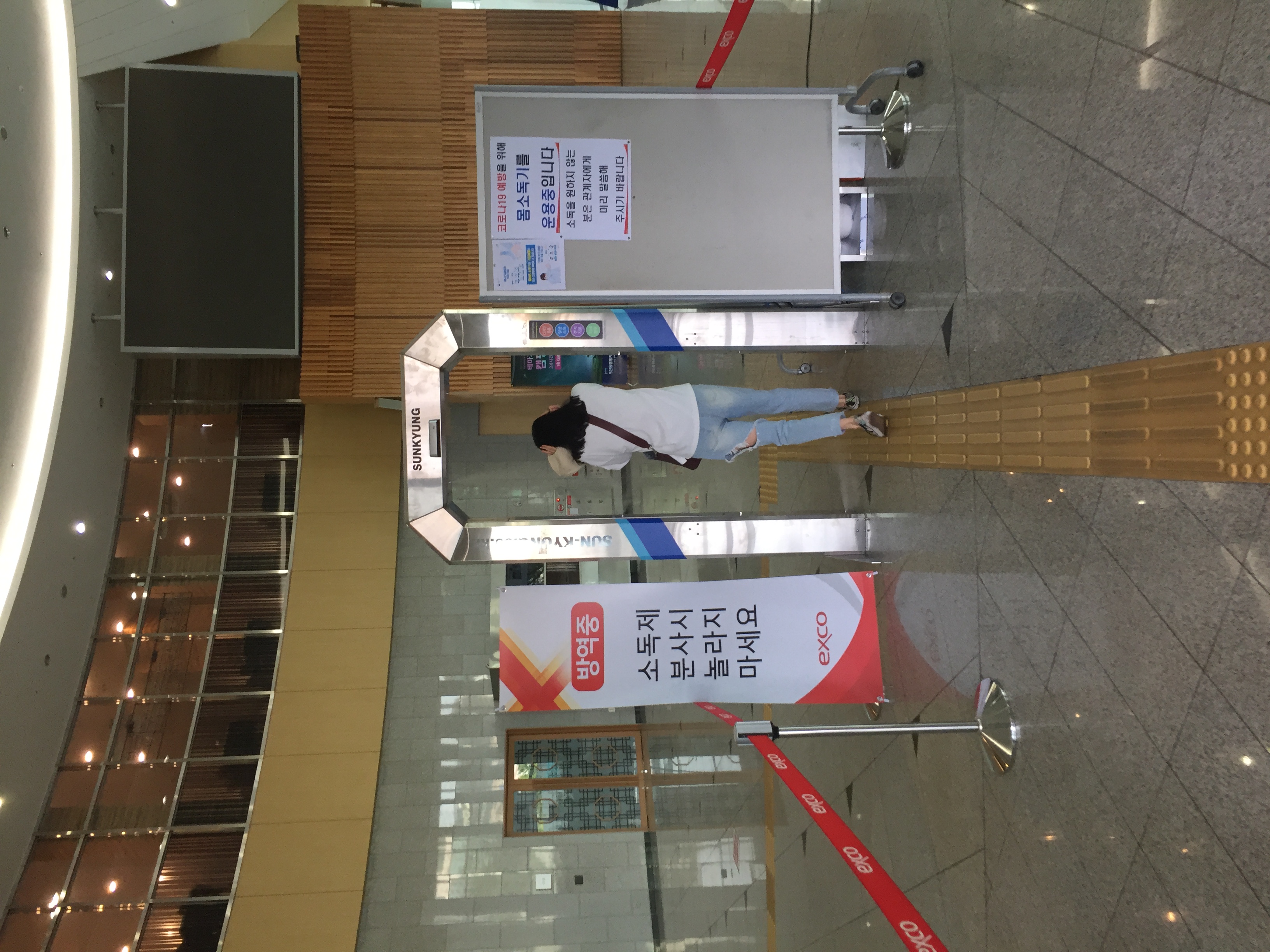 건물 안으로 입장하면 위 사진과 같은 소독기가 있다. 공항 탐색기와 비슷하게 생긴 "몸 소독기"를 통화하면 되는데, 생각보다 소리가 크다. 내 앞에 있던 여자분은 경험이 있는지 귀를 막고 지나갔다. 몸 소독기를 지나면 열화상 카메라로 체온을 측정한다.