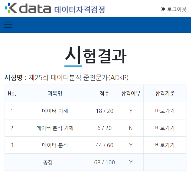 전체 점수는 68점으로 합격 기준 점수인 60점을 넘겼는데, 2과목에서 과락이 발생했다. 딱 1문제가 부족했다.