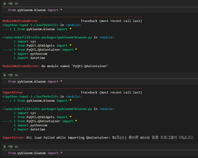 두번째 코드 오류 : ImportError: DLL load failed while importing QAxContainer: %1은(는) 올바른 Win32 응용 프로그램이 아닙니다.