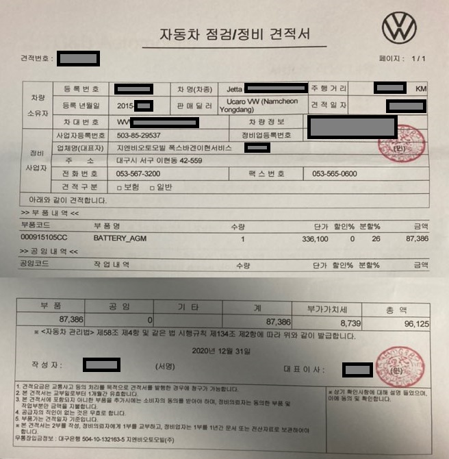 폭스바겐 디젤게이트 여파로 모든 오너에게 지급된 WCC(We Care Campaign) 100만원 바우처가 아직 많이 남아 있어서, 공식 서비스 센터에서 배터리를 교환하고자 방문했다.