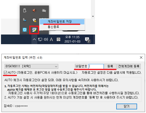 윈도우 작업표시줄 오른쪽 아래에 빨간색 상자로 표기된 아이콘에 마우스 우클릭하여 자동로그인을 설정한다.