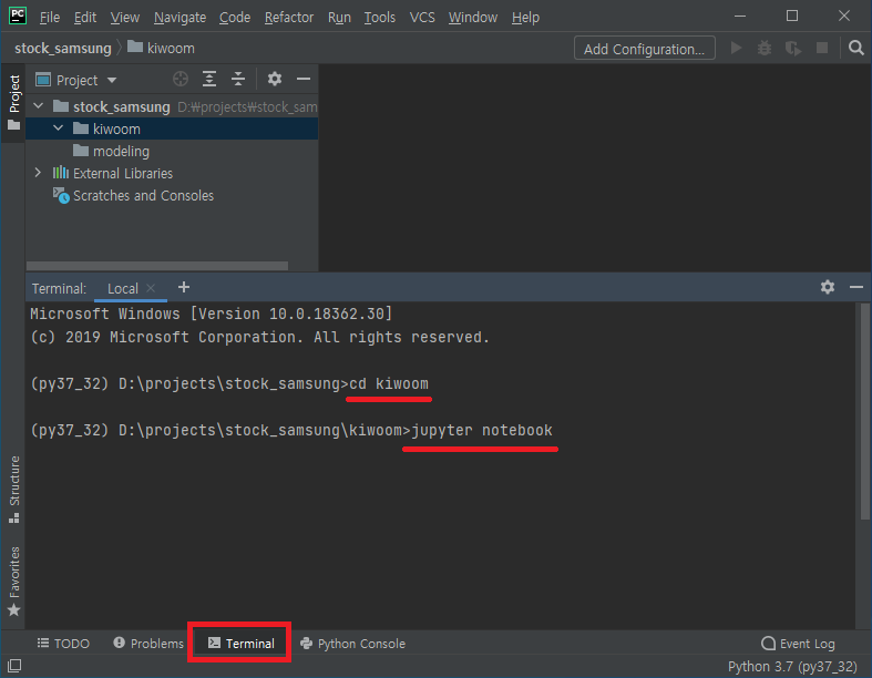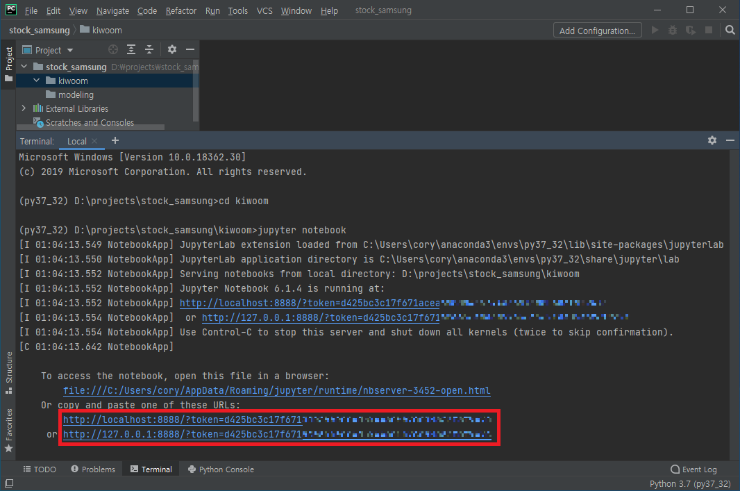 파이참 하단에 "Terminal"을 눌러준다. 터미널은 윈도우의 CMD 창과 같은 창이다. 주피터 노트북을 실행할 폴더로 이동한 뒤, jypyter notebook를 입력하고 엔터를 눌러준다.