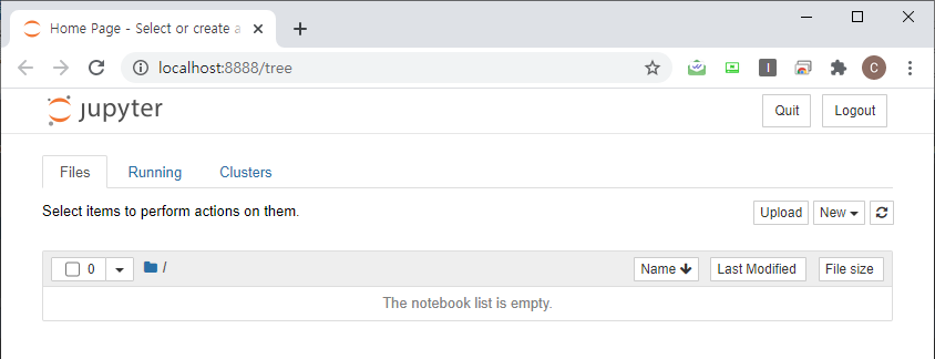 실행 과정이 나타나고, 위 빨간 상자와 같이 주소가 출력되면 끝이다. 그리고 자동으로 브라우저(크롬 등)가 열릴 것이다. 브라우저가 자동으로 열리지 않으면 위 빨간 상자의 주소 2줄 중 한 줄을 복사한 후, 브라우저 주소에 입력하고 엔터를 누르면 다음과 같이 마음이 편안해지는 주피터 노트북이 열린다.
