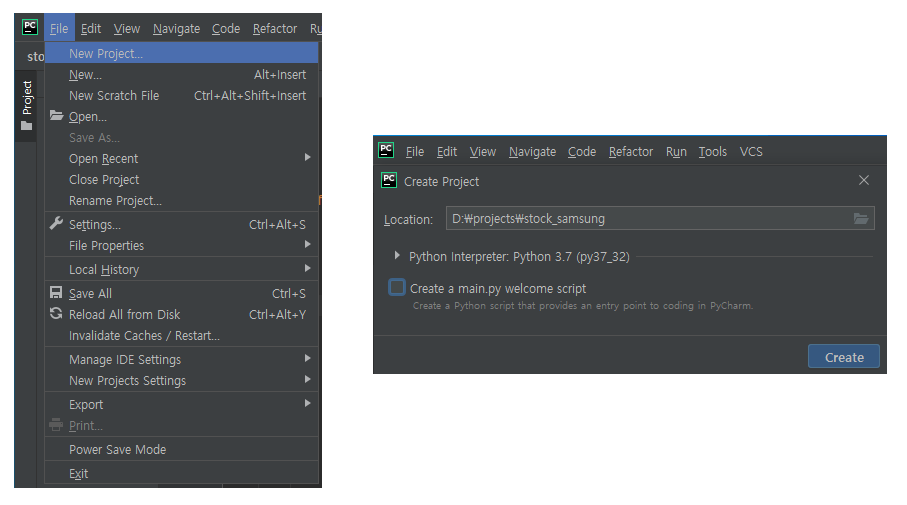 파이참에서 새로운 프로젝트를 만들고, 폴더명을 정해준다.