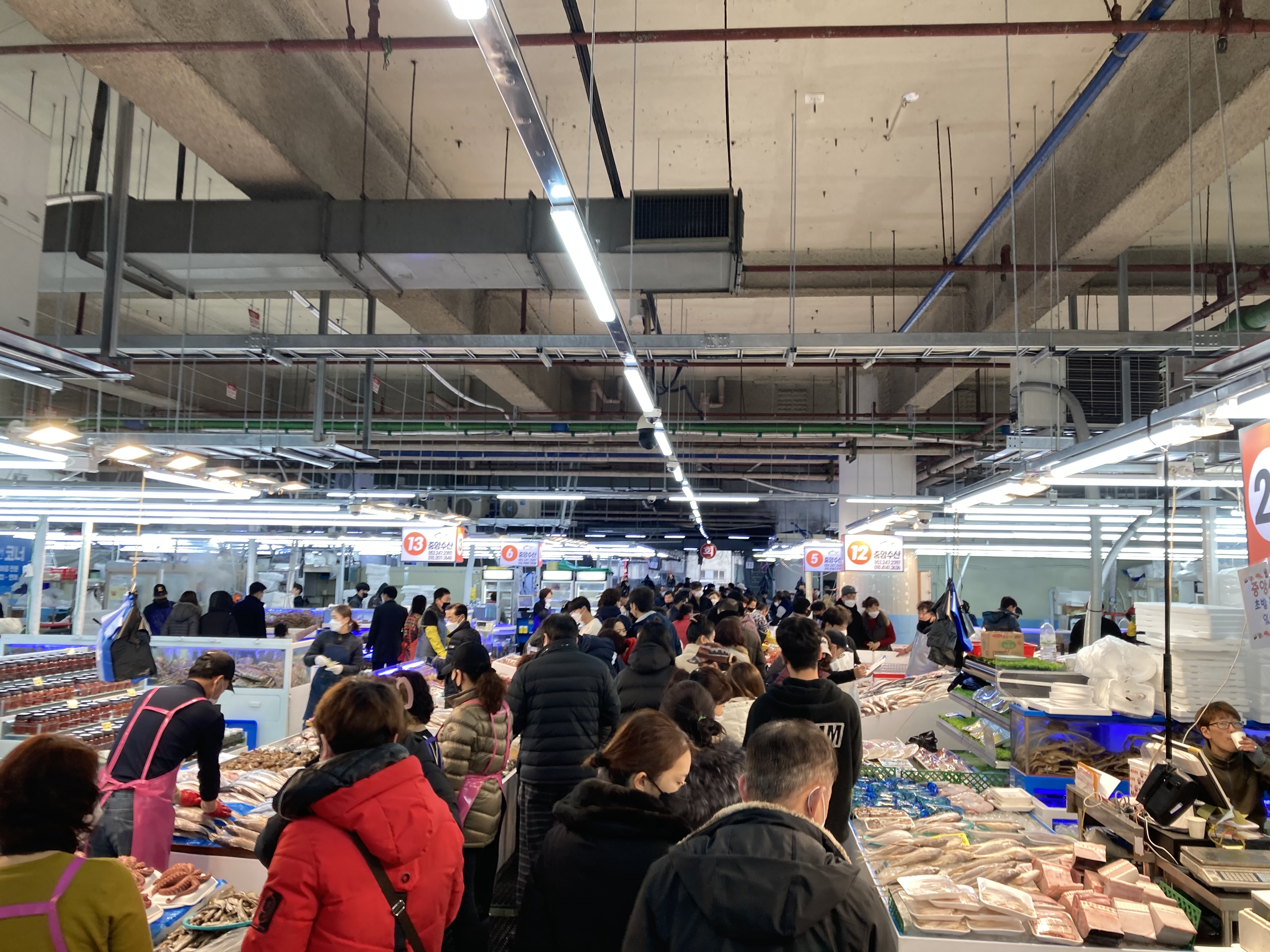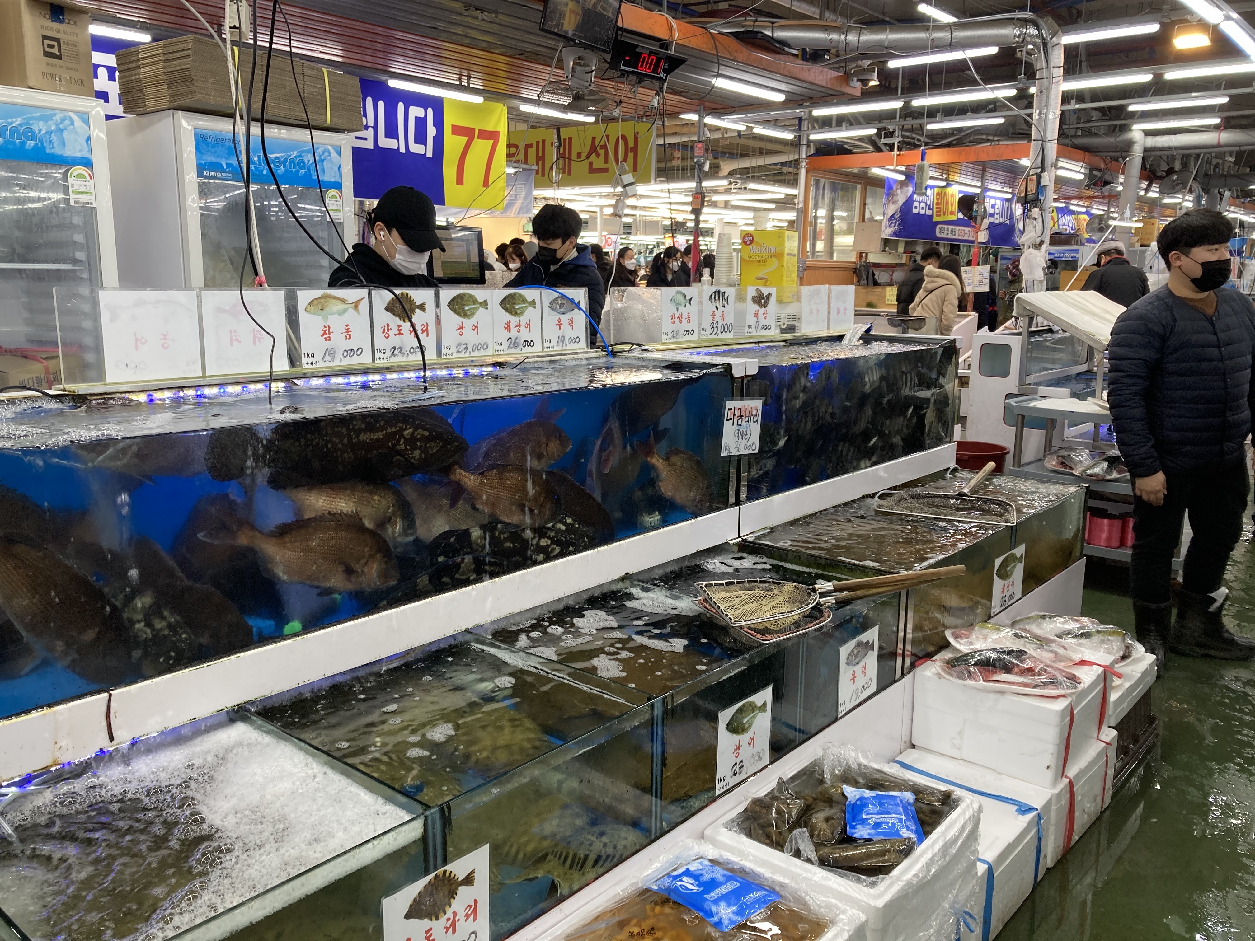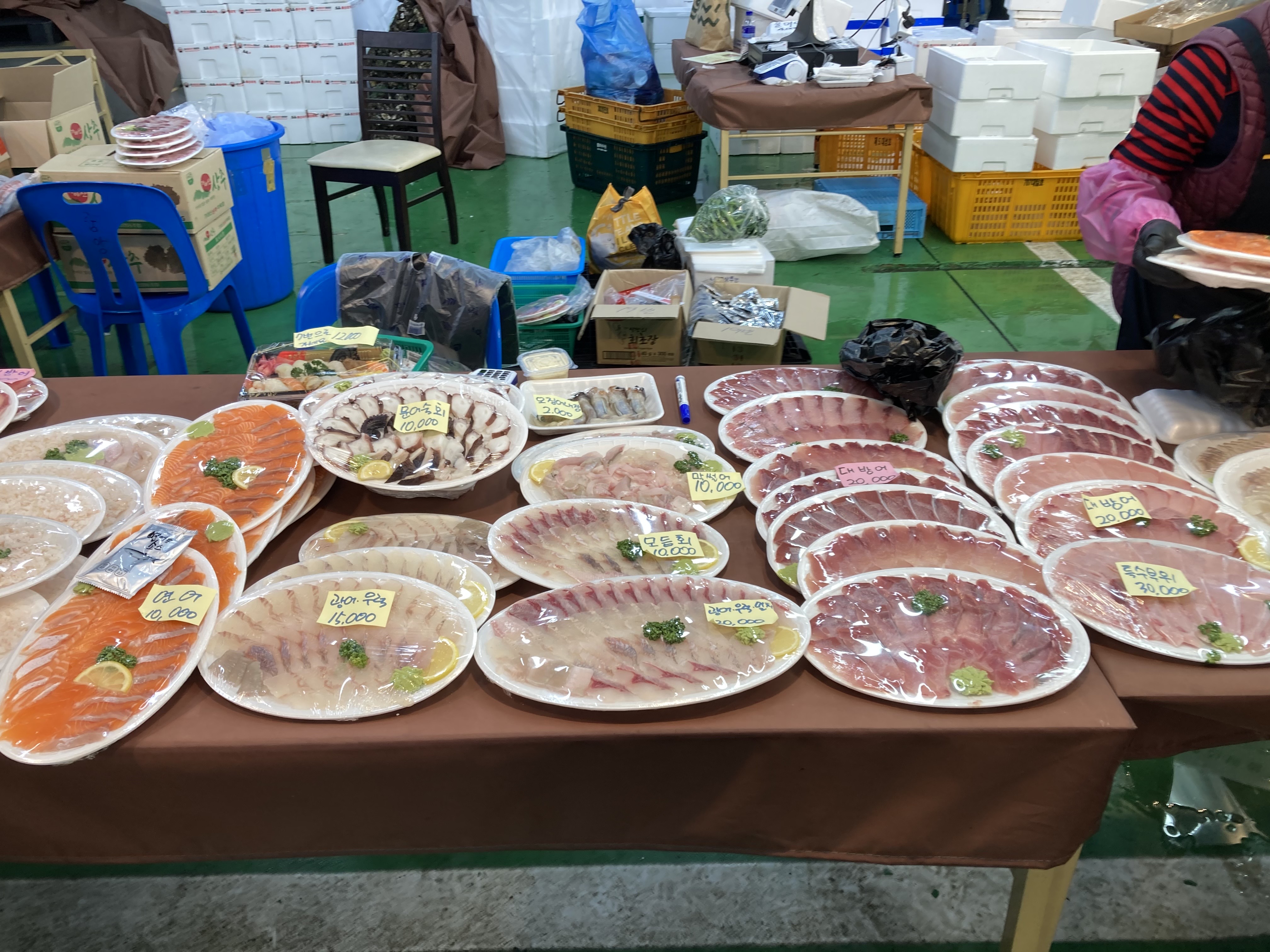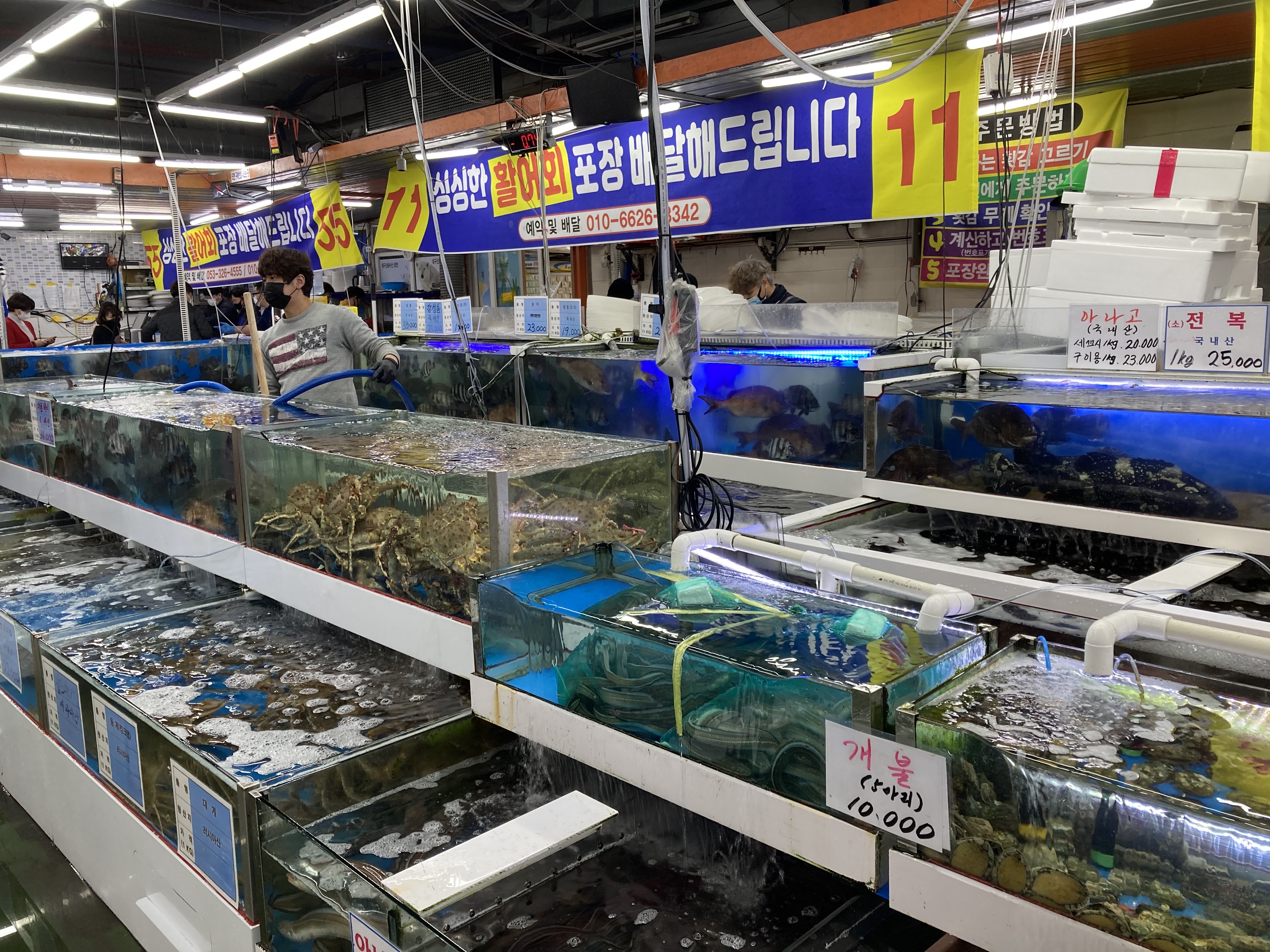 등등 많은 수산물들이 있었다. 내와 와이프가 좋아하는 개불은 5마리 만원이라서 좀 사고 싶었는데, 작업하는데 30분 이상 걸린다는 곳도 있고, 어떤 곳은 뻔히 개불이 있는데 안 판다는 곳도 있었다. 개불 작업이 귀찮고 시간도 많이 걸리니 회전율과 단가가 높은 활어를 더 팔려는 것으로 보였다.