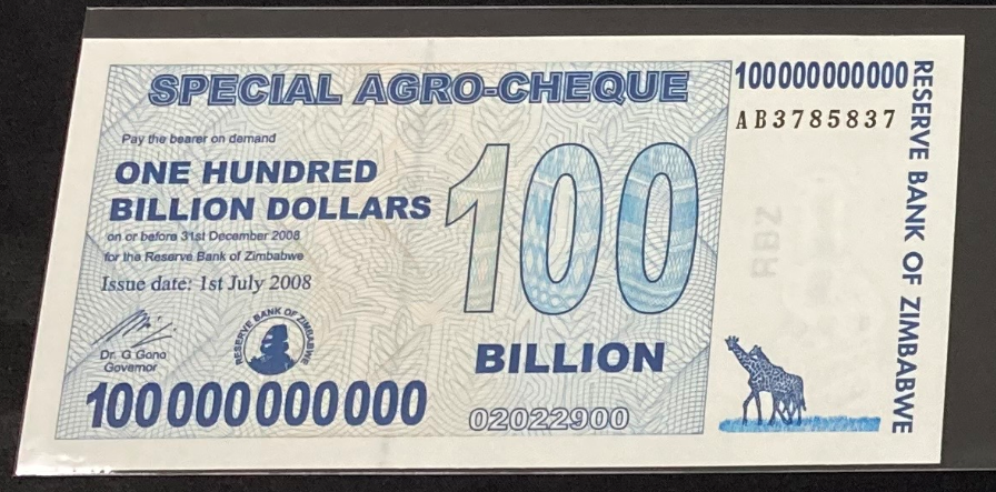 100조 달러의 유명세에 밀려 1000억 달러 지폐가 별로 유명하지 않다. 위 1000억 달러 지폐를 1달러로 화폐개혁(리디노미네이션)하고, 그 1달러가 결국 아래의 100조 달러까지 상승하게 된다.