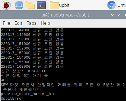 신규 상장 후 5분 동안 매수 주문이 제한되므로 5분 대기 후 매수 주문을 넣었는데, 5분이 다 지나기 전에 주문이 들어가 버렸는지 업비트에서 오류는 반환하고 매수에 실패했다. 아쉬운 마음을 뒤로하고 또다시 개선을 다짐했다. 신규 상장이 정말 가끔 발생하는 이벤트이기 때문에 내가 만든 코드가 오류 없이 잘 실행되는지 알기가 너무 힘들다.