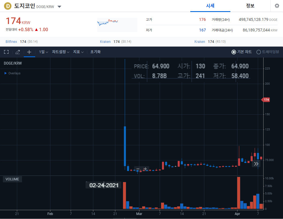 2021년 2월 24일 신규 상장한 도지코인(DOGE)은 130원으로 시작하여 고가 241원을 기록하며 85.4% 상승하였지만, 상승분을 모두 반납하고 저가 58.4원으로 -55.1%로 급락하였다.