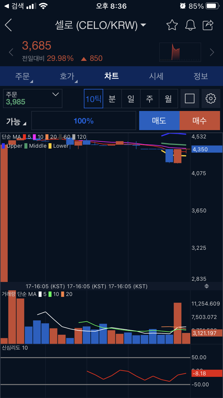 위 차트는 셀로 CELO의 신규상장 당시 10틱 캔들이다.