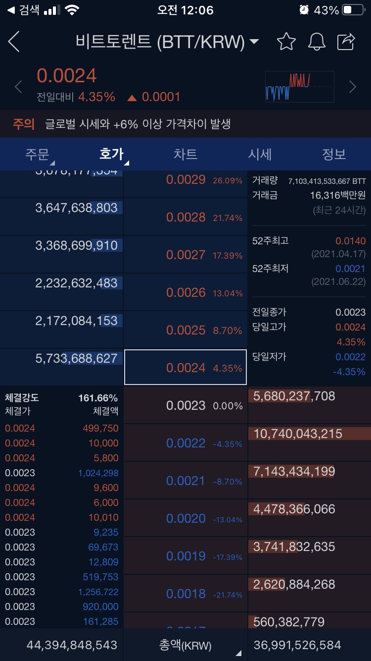 비트토렌트는 1호가당 가격변동폭이 4%를 넘어서며, 호가당 매매물량도 엄청나다. 어쩌다가 0.0024원에 매수가 돼버리면, 0.0025원까지 가면 좋겠지만 가기가 매우 힘들다. 손절을 하려면 0.0023원에 해야 하는데, 순식간에 -4% 손실이 생긴다.