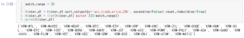 "ticker_df = list(ticker_df['market'][0:watch_range])"를 통해 24시간 누적 거래량 상위 30개를 리스트로 생성한다.
