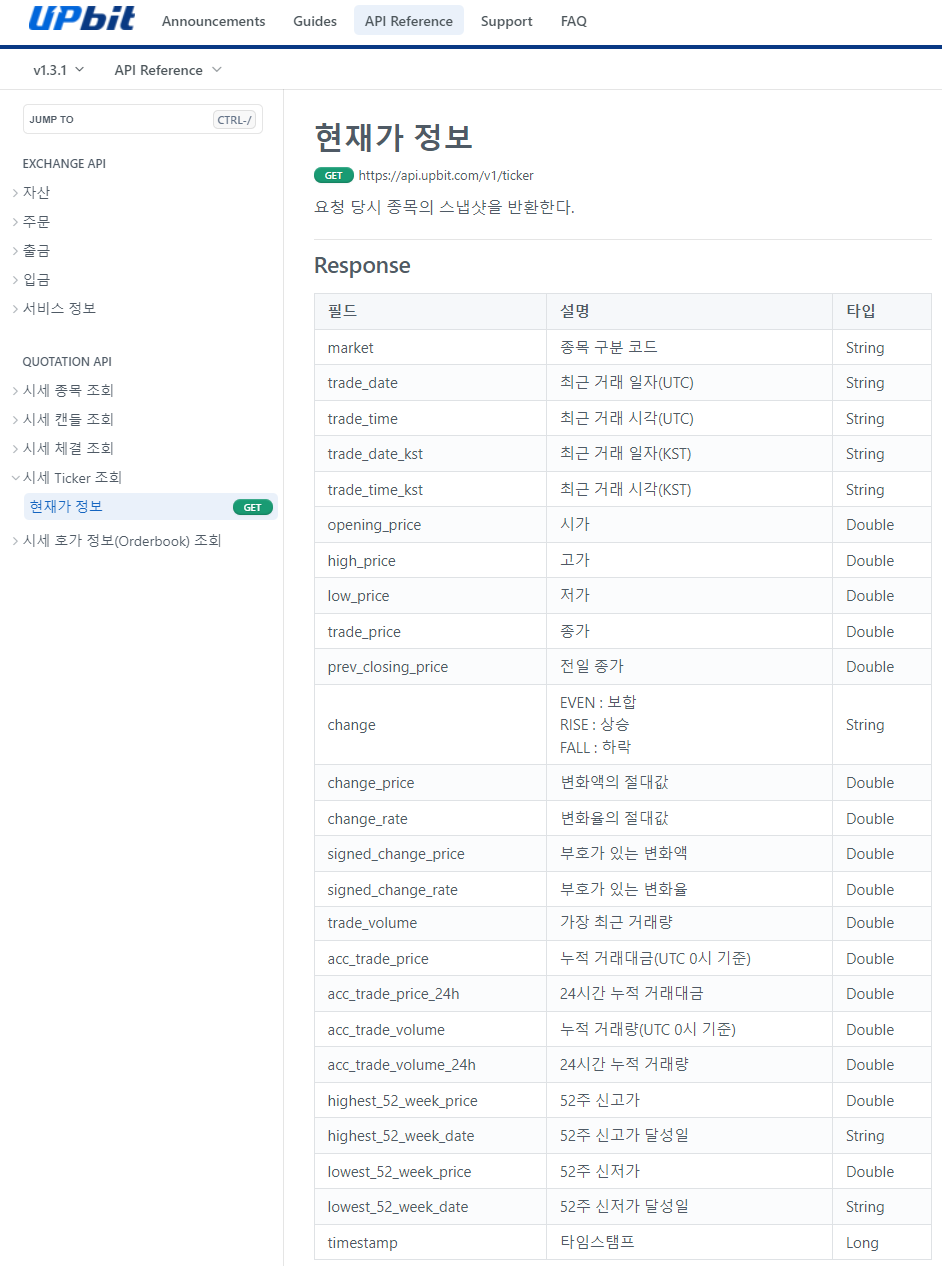 현재가를 조회하면 위와 같이 json형태의 데이터를 확인할 수 있다. 필드명별 정의는 업비트의 api 페이지에서 확인할 수 있다.