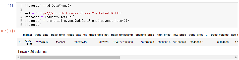 requests 라이브러리에 url을 넘기면 위에서 본 json 형태의 데이터를 다운로드할 수 있다. 그 데이터를 pandas의 dataframe 형태로 변환하면 보기 좋게 변환된다.