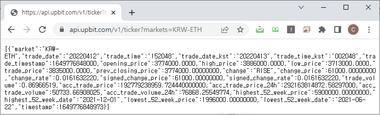 "https://api.upbit.com/v1/ticker"로 업비트 api를 통해 현재가 정보를 조회할 수 있다. 끝부분에 "?markets=KRW-ETH" 등과 같이 코인 이름을 파라미터로 붙여주면 해당 코인의 현재를 조회할 수 있다.