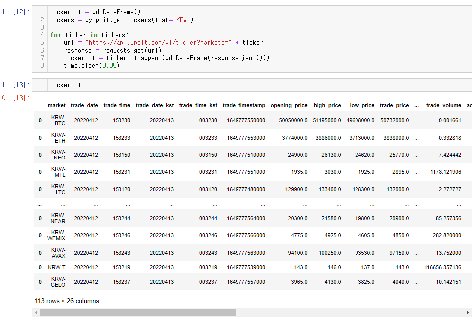 위 활동을 한화 마켓에 상장된 113개의 모든 코인에 적용하는 for 문을 실행하면 다음의 결과를 확인할 수 있다.