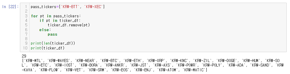 총 코인 수가 30개에서 29개로 줄었고, "KRW-XEC"가 리스트에서 제외된 것을 확인할 수 있다.