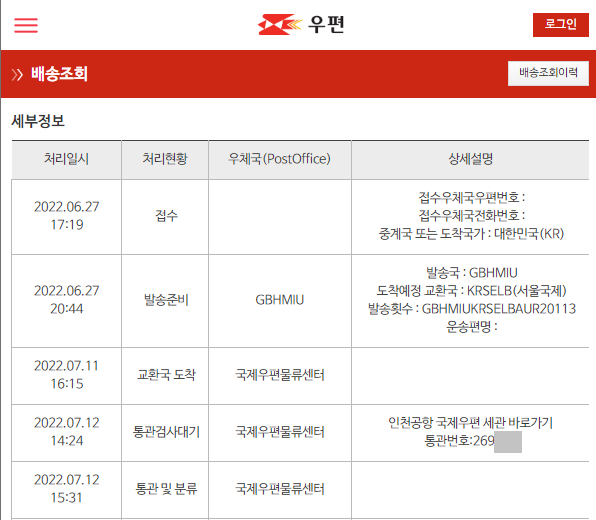 배송을 추적하다보면 "통관검사대기 (통관번호: 26***)" 과 같은 상태가 보이면 물건이 통관 대기 중이며, 이때 재빠르게 진행시켜줘야 물건을 빨리 받을 수 있다.