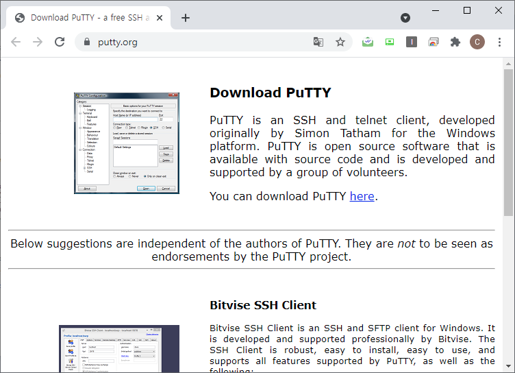 음.. 무슨 말인지 모르겠다. 간단히 생각하면... 리눅스 계열의 서버에 원격으로 접속할 수 있는 프로그램이다. 라즈베리파이가 리눅스 기반이니, 라즈베리파이에 원격으로 접속해서 몇 가지 설정을 하기 위해 필요하다. pc에서 putty 공식 홈페이지로 이동하여 간단히 설치할 수 있다.