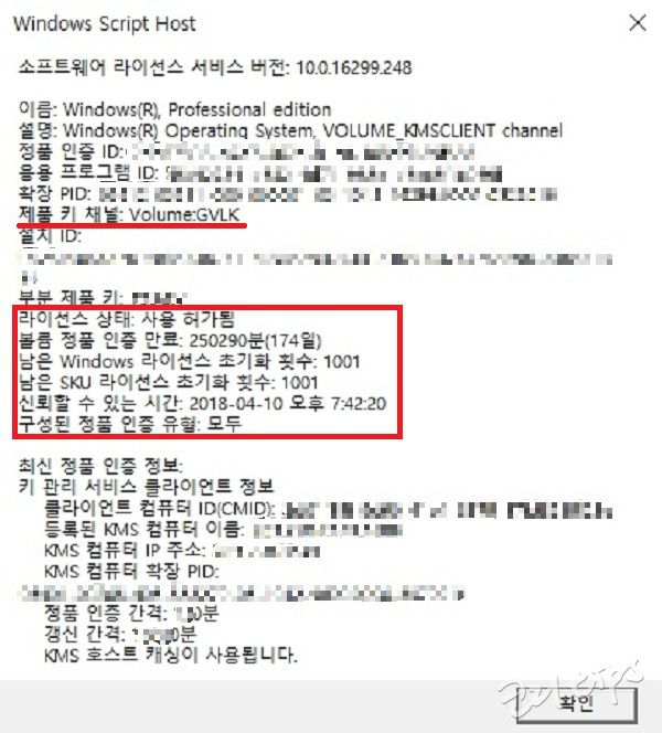 slmgr /dlv [Activation ID | All] : 자세한 라이센스 정보 표시(기본값 : 현재 라이센스)