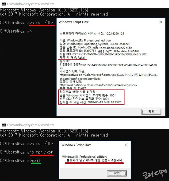 - "slmgr /dlv"를 입력하면 위 그림의 흰색 큰 대화창이 모습을 드러낸다. 제품키 채널이 retail이고, 라이센스 상태가 "사용허가됨"임을 확인할 수 있다.- 대화창을 닫고 이번에는 "slmgr /xpr"을 입력하면 위 그림의 흰색 작은 대화상자가 나타난다. "컴퓨터가 영구적으로 정품인증 되었습니다" 라는 반가운 메시지를 보여준다.