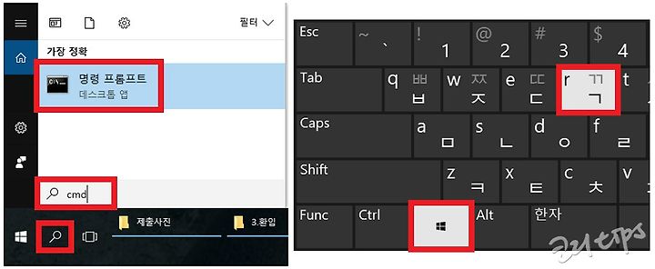 - 키보드의 "윈도우키+R"을 눌러주면 "실행" 대화창이 호출되는데 여기에 cmd 라고 입력하는 방법도 있다.