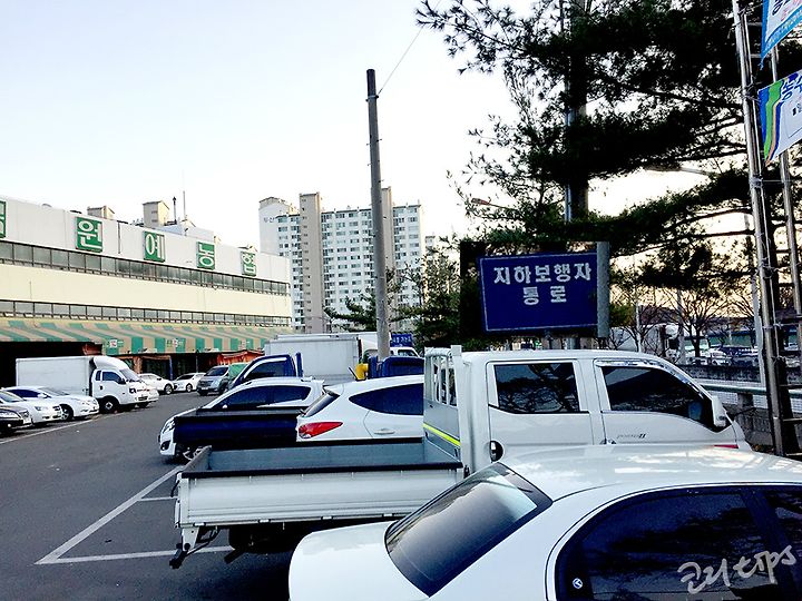 <그림2>의 파란점선을 따라 지하도로 이동하면 <사진2>와 같이 수산동 매천수산시장이 모습을 보인다. 하지만 100m 조금 넘는 길이인데 어둡고 퀴퀴해서 서둘러 지나가고 싶은 마음이 든다. 지하도에 인도와 차도가 함께 있어 공기도 좋지 않다. 그래도 위험을 무릎쓰고 무단횡단 하는 것보다는 좋은 선택이다.