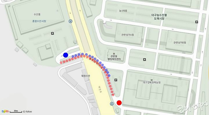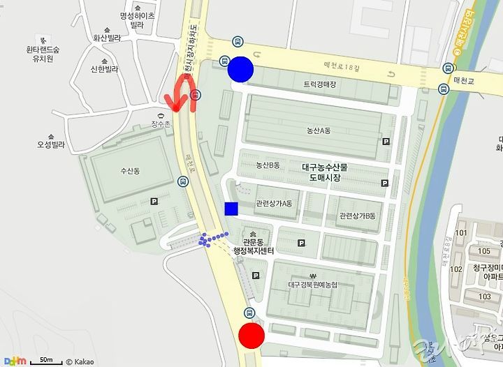 과거에 매천수산시장을 찾았을 때, 차를 가지고 시장 안까지 진입하는데 별 어려움이 없었다. 그래서 이번에도 차를 시장 안에 주차할 생각으로 출발했는데, 수산시장 근처에 도착하자 어렵겠다는 생각이 들었다. 신천대로를 타고 매천대교를 건너 진입하게 되면 <그림1>의 빨간색 화살표 자리에서 유턴해서 수산시장으로 진입해야 하는데, 유턴 지점 훨씬 이전인 빨간색 점 인근부터 차가 밀리기 시작했다. 유턴하기 위해 대기하고, 시장에 진입하고, 주차하는데 아무리 빨라도 3~40분은 걸릴 거 같았다.