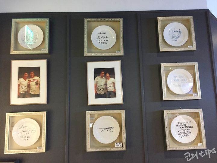- 강민호, 박지성, 이대호 등의 사진과 싸인 접시가 있었다.