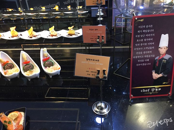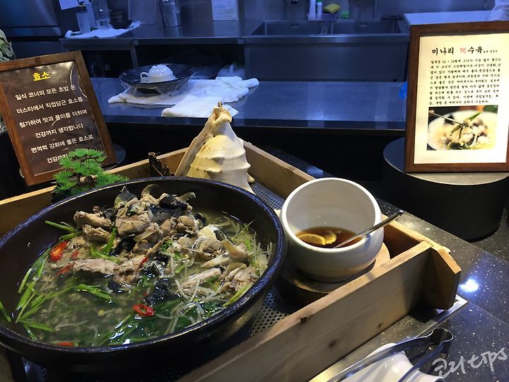 회코너 옆에는 <사진4>의 복미나리 수육이 있는데, 뷔페에서 이 메뉴를 처음 봤다. 좋아하는 음식이기도 해서 한 그릇 먹어보았는데 맛은 기대 이하였다. 일단 복어가 너무 터벅했다. 흡사 닭가슴살을 먹는 것처럼 터벅했다. 그리고 수육이라서 국물과 함께 먹고 싶었는데, 국물을 덜어갈 수 있는 국자를 제공하지 않고 있었다.